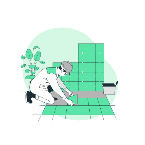 "Floor tiles fitting" refers to the process of installing or attaching floor tiles to a surface, typically involving applying adhesive, placing the tiles, and then filling the joints with grout.